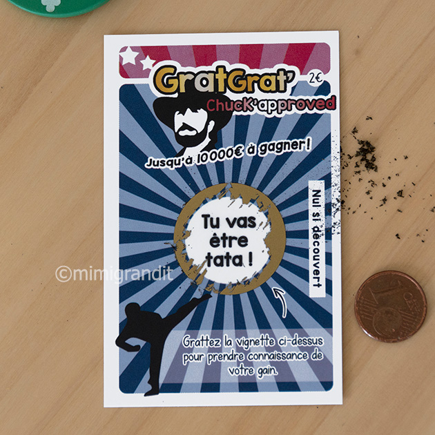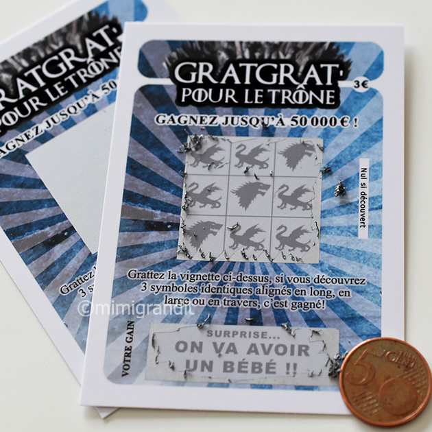 Les vignettes des tickets à gratter d’annonce grossesse ne sont pas imprimées directement sur le papier cartonné comme pour les jeux à gratter réalistes; il s’agit de pastilles collées après impression. Elles sont légèrement plus « difficiles » à gratter que sur les jeux réalistes, je vous conseille dans tous les cas (pour tous les grattages) d’utiliser un cent rouge.